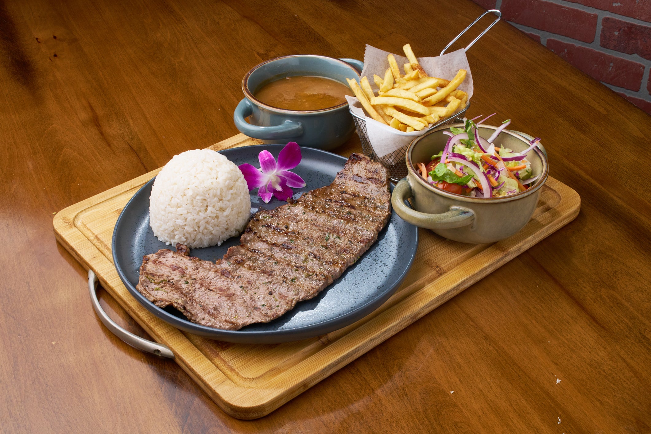 Carne asada accompanied by rice, beans, salad, and french fries.